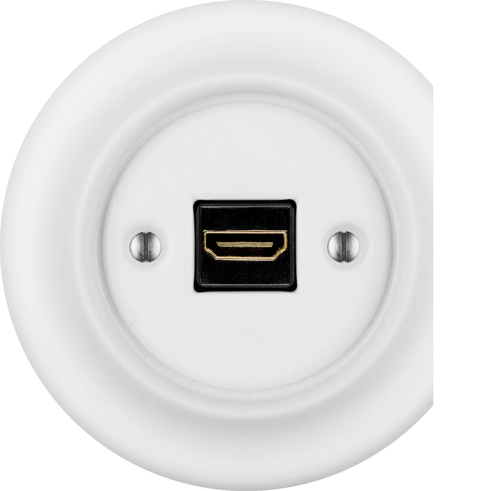 Moderne porselen HDMI -kontakt inspirert av retro design. Brukes til å koble TV -en til multimediakilder. Fordi de også er i stand til å overføre lyd- og internettforbindelser, er det ikke nødvendig å koble dusinvis av kabler til fjernsynet. Med glassert overflate. I design - matt hvit. Med en svært slitesterk overflate og fargebestandighet. CE -samsvarsertifikat. Dekorativt omslag. 50 års garanti!